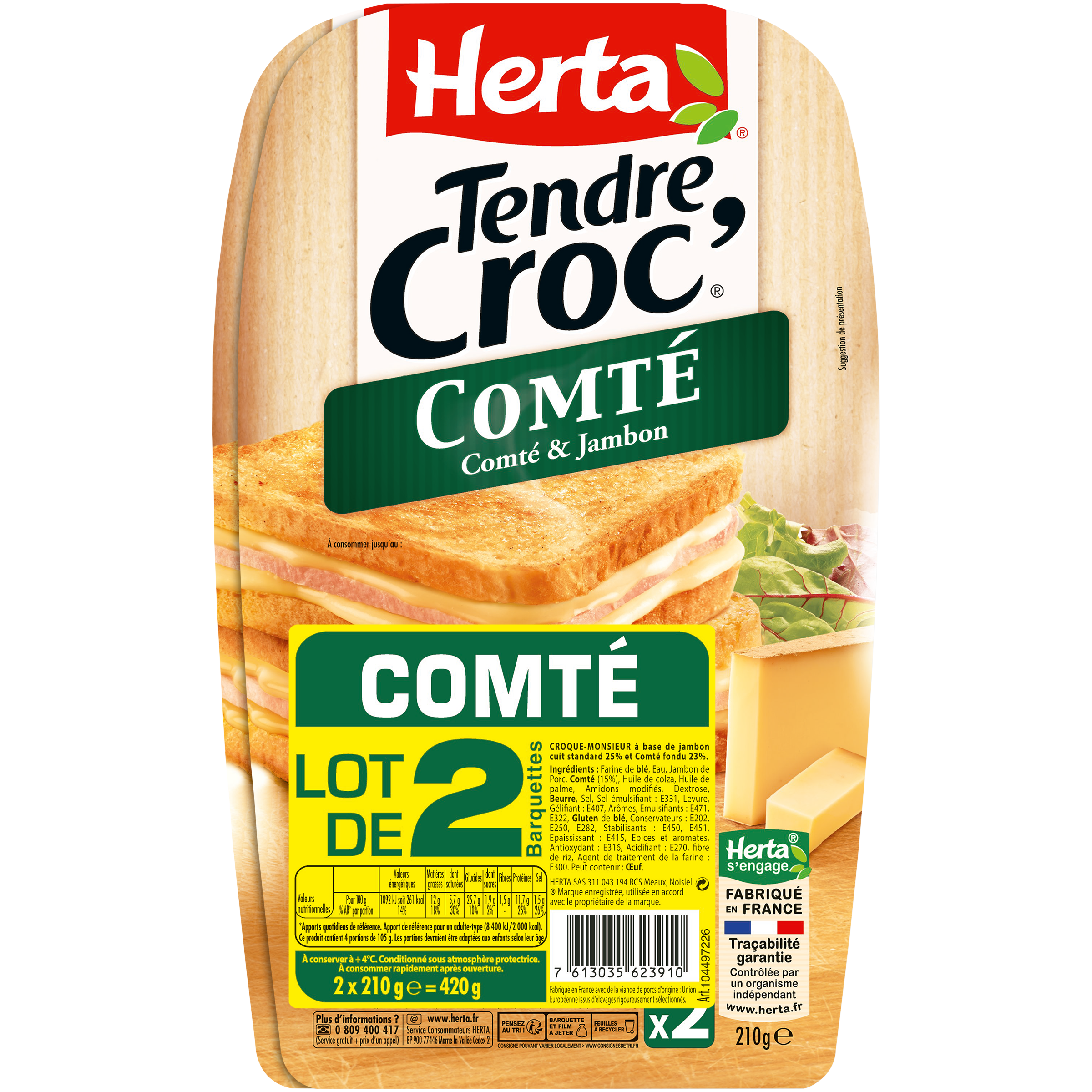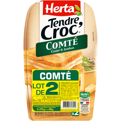 Ingrédients: Farine de BLE, eau, jambon de porc, COMTE (15%), huile de colza, huile de palme, amidons modifiés, dextrose, BEURRE, sel, sel émulsifiant : E331, levure, gélifiant : E407, arômes, émulsifiants : E471, E322, GLUTEN de BLE, conservateurs : E202, E250, E282, stabilisants : E450, E451, épaississant : E415, épices et aromates, antioxydant : E316, acidifiant : E270, fibre de riz, agent de traitement de la farine : E300. Viande de porcs d'origine : Union Européenne issus d'élevages rigoureusement sélectionnés. Peut contenir : œuf.