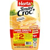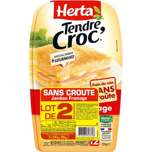 Croque-monsieur à base de pain de mie sans croûte 47%, de fromage fondu 24% et de jambon cuit standard 22% Savourez les croque-monsieur TENDRE CROC' Sans Croûte Jambon Fromage : deux tranches de pain de mie sans croûte avec une garniture au jambon et au fromage délicieusement fondante. Les croque-monsieur de HERTA, c'est la solution pratique pour une pause déjeuner, un dîner gourmand en famille ou entre amis. Au four ou à la poêle, tout le monde se régale !