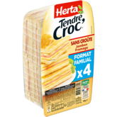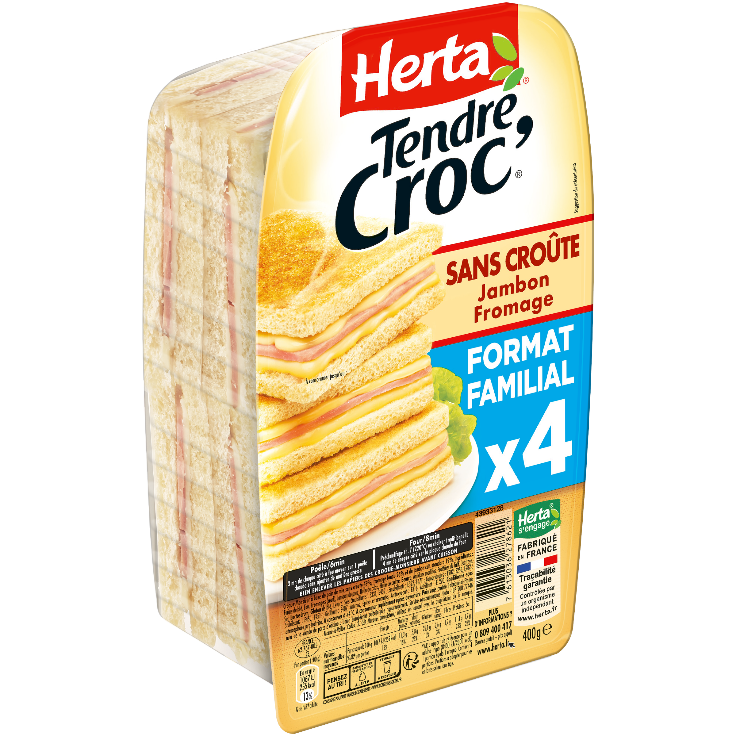 Savourez les croque-monsieur TENDRE CROC' Sans Croûte Jambon Fromage : deux tranches de pain de mie sans croûte avec une garniture au jambon et au fromage délicieusement fondante. Les croque-monsieur de HERTA, c'est la solution pratique pour une pause déjeuner, un dîner gourmand en famille ou entre amis. Au four ou à la poêle, tout le monde se régale ! Croque-monsieur à base de pain de mie sans croûte 49%, fromage fondu 26% et de jambon cuit standard 19%