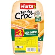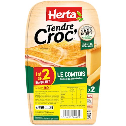 Ingrédients: Farine de BLE, jambon de porc, eau, COMTE 14,3%, huiles végétales (colza, palme), amidons modifiés, BEURRE, sel, levure, sucre, sel de fonte : E331, GLUTEN de BLE, arômes, gélifiant : E407, conservateurs : E202, E282 ; stabilisants : E450, E451 ; dextrose, arôme naturel (présence naturelle de polyphénols), antioxydant : acide ascorbique, émulsifiant : E471, jus de citron concentré. Viande de porc rigoureusement sélectionnée d'origine UE. Peut contenir : oeuf.