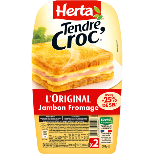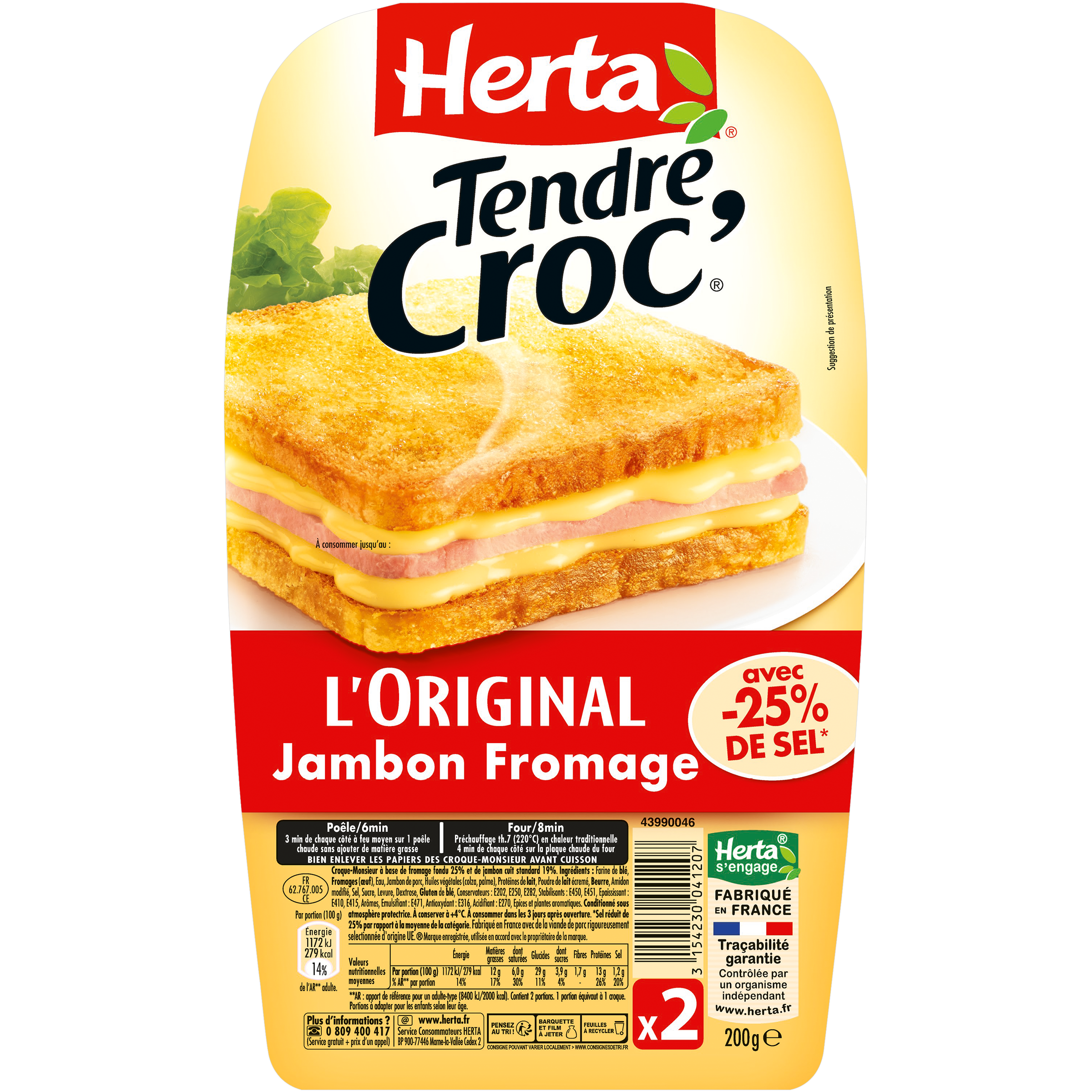 Croque-monsieur à base de fromage fondu 25% et de jambon cuit standard 19% Savourez les croque-monsieur TENDRE CROC' Original Sel Réduit : deux tranches de pain de mie moelleuses avec une garniture au jambon et au fromage délicieusement fondante, à la teneur en sel réduite. Les croque-monsieur de HERTA, c'est la solution pratique pour une pause déjeuner, un dîner gourmand en famille ou entre amis. Au four ou à la poêle, tout le monde se régale !