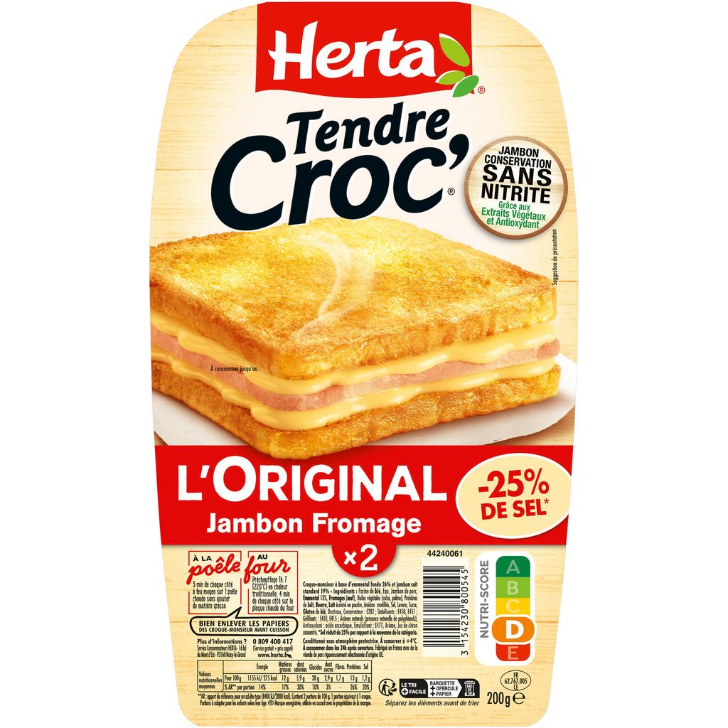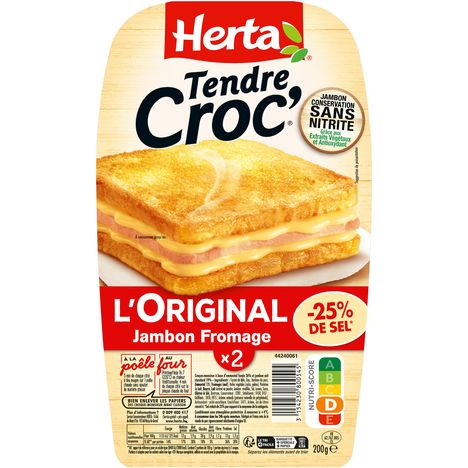 Savourez le croque-monsieur TENDRE CROC' -25% de Sel* Jambon Fromage : deux tranches de pain de mie moelleuses avec une garniture au fromage fondant et au jambon conservation sans nitrite grâce aux extraits végétaux et antioxydant, avec une teneur en sel réduite*. Les croque-monsieur de HERTA, c'est la solution pratique pour une pause déjeuner, un dîner gourmand en famille ou entre amis. Au four ou à la poêle, tout le monde se régale ! *-25% de sel par rapport à la moyenne de la catégorie