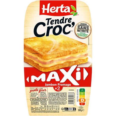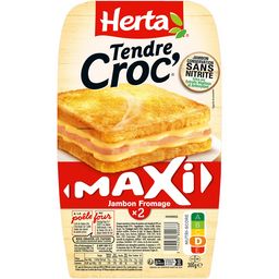 Savourez le croque-monsieur TENDRE CROC' Maxi Jambon Fromage : deux tranches de pain de mie à la fois croustillantes et moelleuses avec une garniture fondante au fromage et au jambon conservation sans nitrite grâce aux extraits végétaux et antioxydant, en format XXL pour faire plaisir aux plus gourmands de la famille ! Les croque-monsieur de HERTA, c'est la solution pratique pour une pause déjeuner, un dîner gourmand en famille ou entre amis. Au four ou à la poêle, tout le monde se régale !