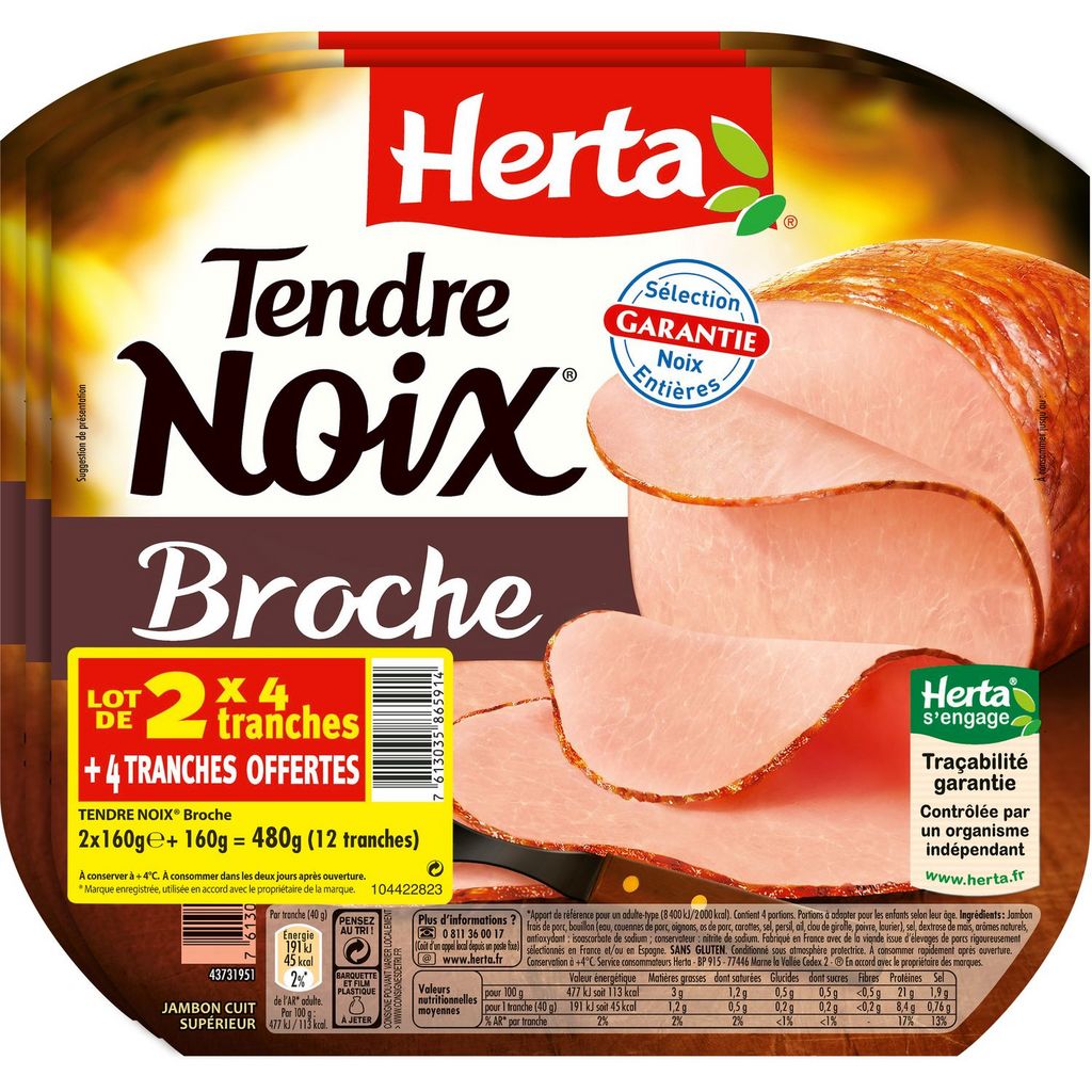 Pour donner toujours plus de saveur à ses jambons TENDRE NOIX, HERTA a un petit secret, le meilleur morceau du jambon : la noix ! Elaboré à partir de noix entières de jambon rigoureusement sélectionnées, TENDRE NOIX à la Broche est un jambon lentement broché de façon traditionnelle, croustillant en surface et moelleux à cœur.