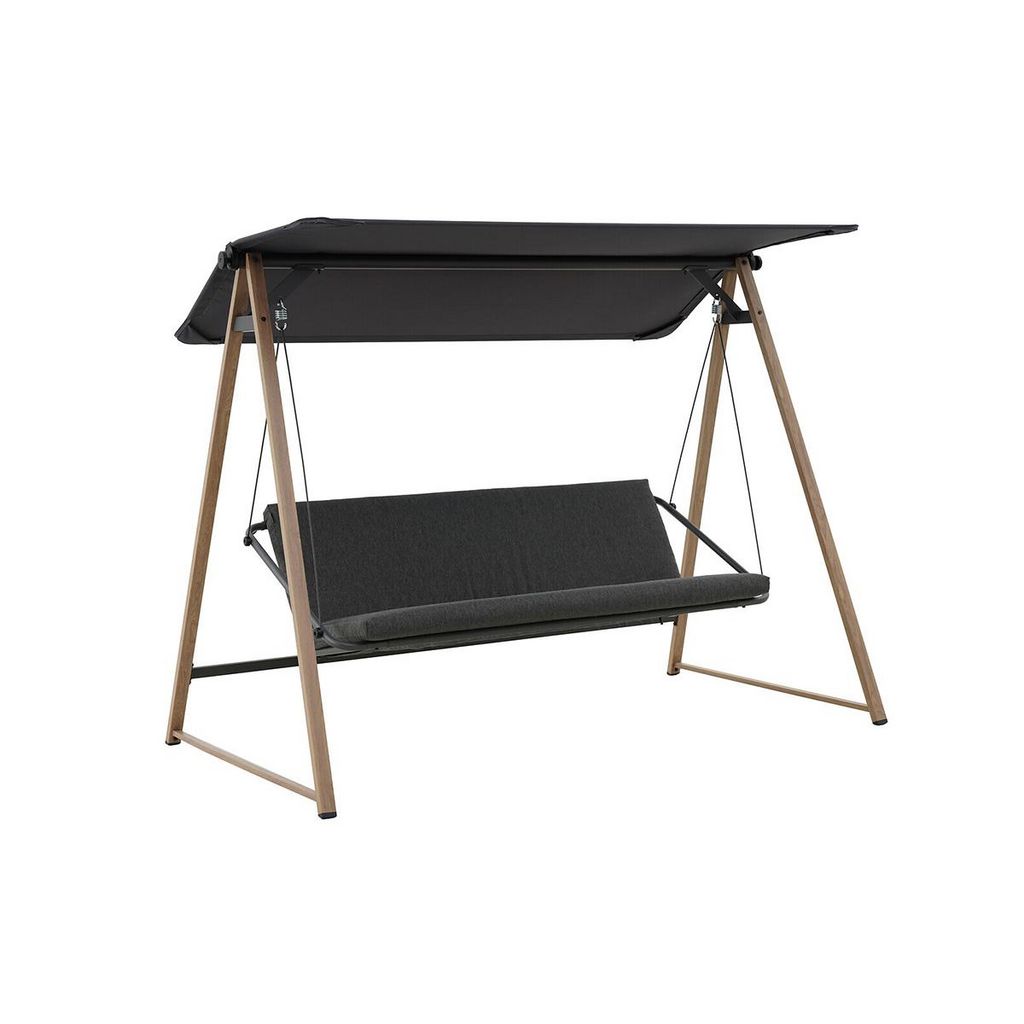 La balancelle Soly 3 places est conçue avec une structure en acier traitée electrodéposition anti-corrosion avec un effet bois par traitement thermique. Munie de coussins et d'un toit en polyester coloris gris charbon, elle donnera un look très moderne et naturel à votre terrasse ou votre jardin.