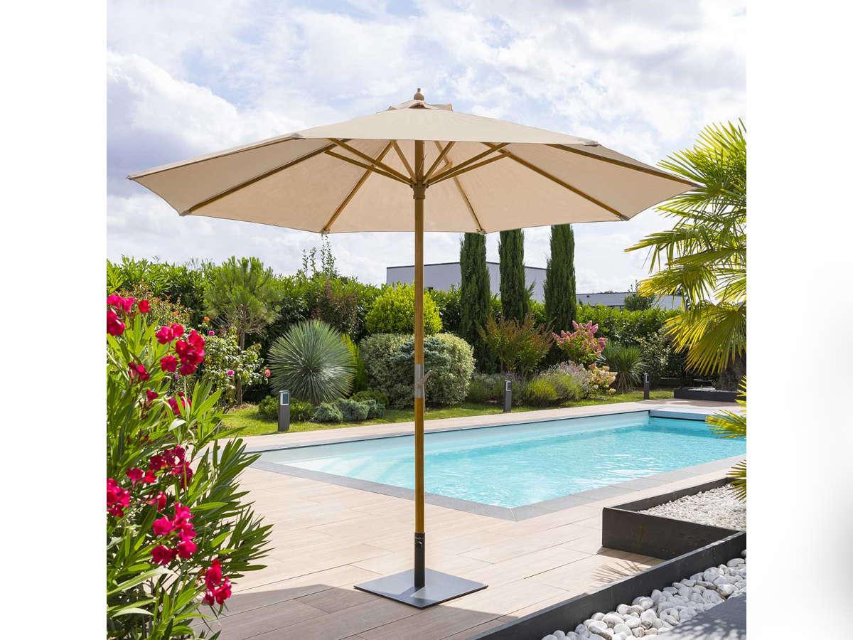 Ce parasol rond est apprécié pour son style invitant la nature : sa structure en bois de bambou est chaleureuse et lui donne un look aussi moderne que traditionnel. Sa toile est disponible en coloris taupe ou noisette.