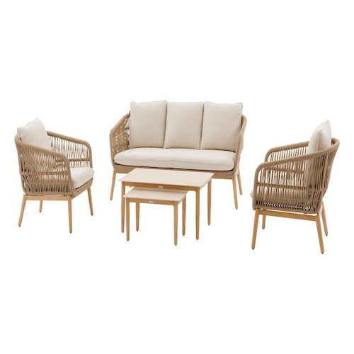 Le salon de jardin Orissa par Hespéride est une solution élégante et conviviale pour aménager un espace extérieur accueillant. Il comprend un canapé 3 places, deux fauteuils et deux tables basses gigognes, tous au design moderne avec un tressage effet bois brossé et des pieds évasés.