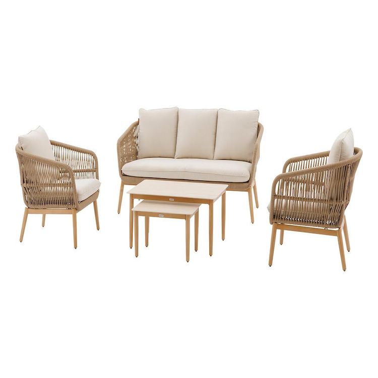 Le salon de jardin Orissa par Hespéride est une solution élégante et conviviale pour aménager un espace extérieur accueillant. Il comprend un canapé 3 places, deux fauteuils et deux tables basses gigognes, tous au design moderne avec un tressage effet bois brossé et des pieds évasés.Ses larges couss