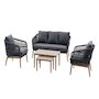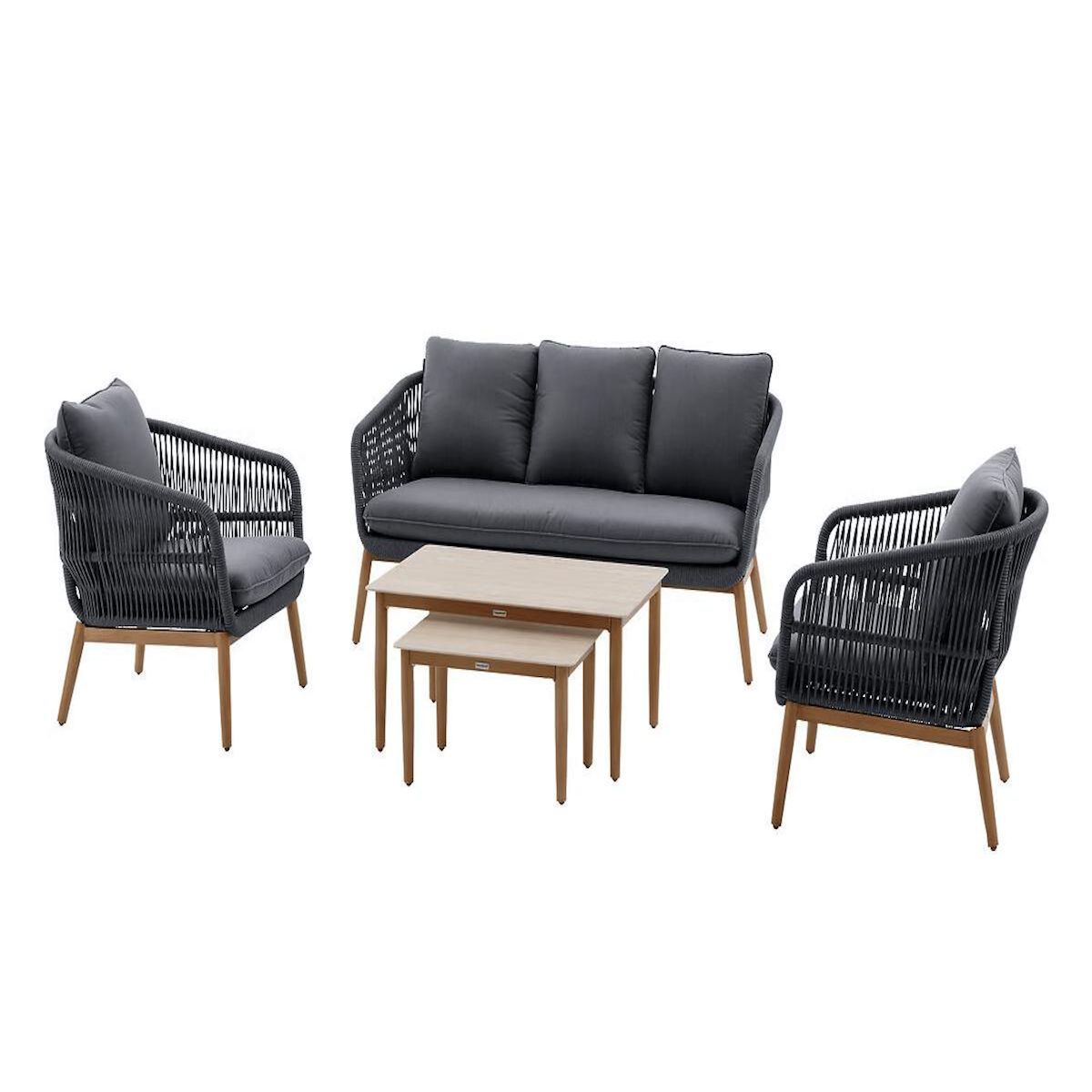 Le salon de jardin Orissa par Hespéride est une solution élégante et conviviale pour aménager un espace extérieur accueillant. Il comprend un canapé 3 places, deux fauteuils et deux tables basses gigognes, tous au design moderne avec un tressage effet bois brossé et des pieds évasés.Ses larges couss