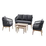 Le salon de jardin Orissa par Hespéride est une solution élégante et conviviale pour aménager un espace extérieur accueillant. Il comprend un canapé 3 places, deux fauteuils et deux tables basses gigognes, tous au design moderne avec un tressage effet bois brossé et des pieds évasés.