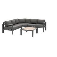 Composé d'un canapé d'angle conçu pour 5 personnes et d'une table basse carrée, l'ensemble est réalisé à partir d'une structure en aluminium teinté et la table basse offre un plateau à lattes. Garni d'épais coussins en tissu déperlant, le canapé accueillera vos invités pour des moments de détente lo