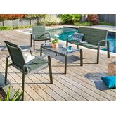 Ce salon extérieur en aluminium peut recevoir jusqu'à 4 personnes grâce à son canapé 2 places et ses 2 fauteuils. Sa table basse incluse vous accompagnera sans faille pour prendre le canapé ou pour partager des moments de convivialité avec vos amis.