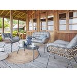 Avec un canapé deux places et deux fauteuils spacieux invitant à la détente, ainsi qu'une table basse pratique, ce salon de jardin est conçu pour créer des moments de relaxation en plein air.