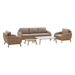 Fait pour accueillir cinq personnes, ce salon de jardin se compose d'un canapé trois places et de deux fauteuils. La table basse avec un plateau en verre trempé est idéale pour déguster une collation. Les pieds sont ajustables pour compenser les petites irrégularités du sol. Le salon de jardin MANIS