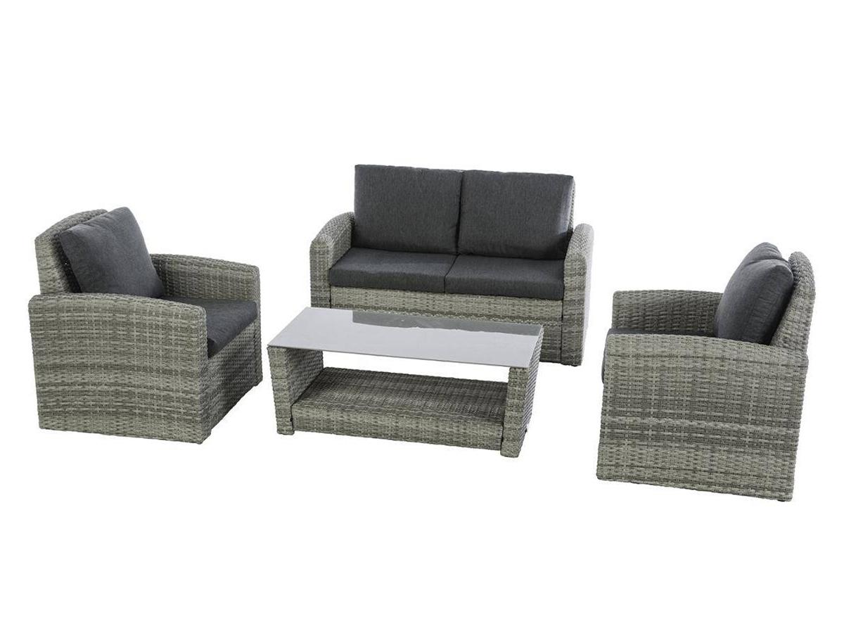 Le salon de jardin Hespéride Polynesia se compose d'un canapé deux places, de deux fauteuils et d'une table basse avec plateau en verre trempé.