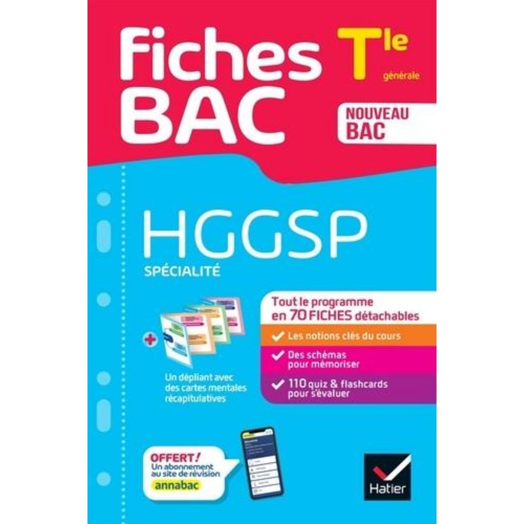 Des fiches de révision conformes au nouveau programme d'HGGSP (Histoire-géographie, Géopolitique, Science politique) Tle générale : un outil 100 % efficace pour réussir l'épreuve de spécialité au bac. L'essentiel du programme d'HGGSP Tle en fiches détachables Sur chaque thème du programme : - des fiches de cours, claires et visuelles - des quiz pour s'évaluer - des flashcards pour réactiver ses connaissances INCLUS : dans un dépliant détachable De grandes cartes mentales pour mieux mémoriser OFFERT : un abonnement au site de révision annabac Pour accéder à des ressources complémentaires en HGGSP et dans d'autres matières : fiches, vidéos, quiz et sujets d'annales corrigés