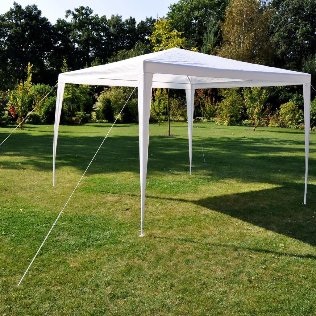 Cette tente de reception d'exterieur est composee d'un cadre metallique robuste, enduit de poudre avec des raccords en plastique (PE) et d'une housse en polyethylene resistant aux UV et a l'eau. De plus, les quatre coins des points de fixation supplementaires ou la tente de reception peut etre ancree dans le sol a l'aide d'une corde et d'une cheville vous garantissent une stabilite de premiere qualite, qui peut bien resister contre le vent fort qui souffle.