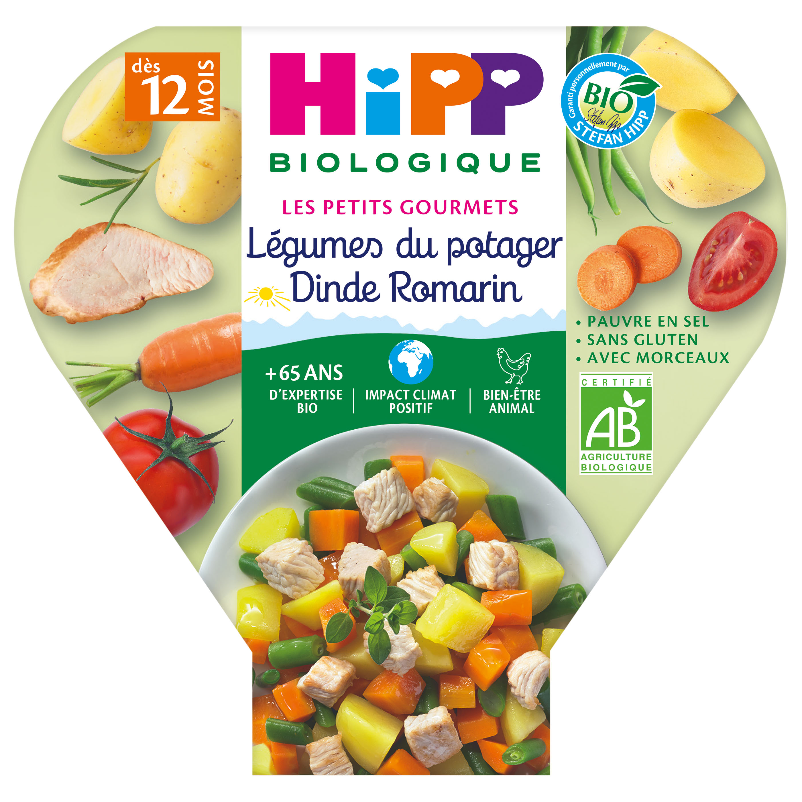 Ingrédients : Pommes de terre* 38%, tomates* 22%, carottes* 15%, dinde* 8%, eau de cuisson, haricots verts* 5%, oignons*, huile de tournesol*, amidon de riz*, sel iodé, aromates* (ail*, romarin*, poivre*), antioxygènes (acide ascorbique, extrait riche en tocophérol1).