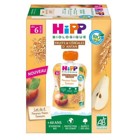 Ingrédients : Fruits* 78% (poires* 40%, pommes* 38%), eau de cuisson, farine d'EPEAUTRE complète* (BLE*) 4%, semoule d'EPEAUTRE* (BLE*) 1,5%, jus de citron*, antioxygène : acide ascorbique.