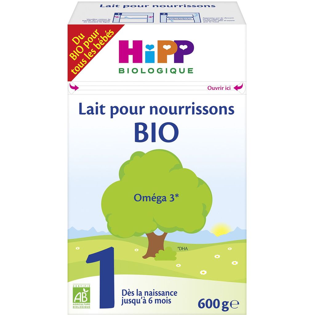 Pourquoi choisir le Lait pour nourrissons HiPP 1 BIO ? Notre dernière génération de Lait pour nourrissons HiPP 1 BIO contient des ingrédients biologiques soigneusement sélectionnés : ✔ Du lait bio issu de vaches nourries d'herbes et de fourrages non traités et sans OGM (<0.9%*), ✔ Des huiles végétales biologiques. ais également des apports nutritionnels adaptés aux besoins de votre bébé : ✔ Acide docosahexaénoïque (DHA), acide gras poly-insaturé à longue chaîne de la famille des omégas 3, ✔Lactose comme seul glucide. *Conformément à la réglementation en vigueur sur le mode de production biologique.