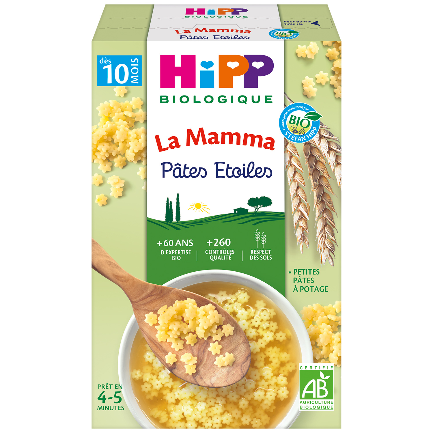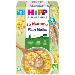 Des féculents spécialement adaptés à Bébé A partir de 8 mois, il est conseillé d'introduire les pâtes et semoule au menu de Bébé. C'est pourquoi HiPP a développé les Pâtes Etoiles La Mamma : ✔ des ingrédients biologiques de grande qualité, ✔ des céréales pour faire le plein d'énergie, ✔ une taille adaptée à la capacité de mastication de votre enfant ✔ et de la vitamine B1 qui contribue au bon développement de son système nerveux. Pâtes biologiques adaptées à l'enfant