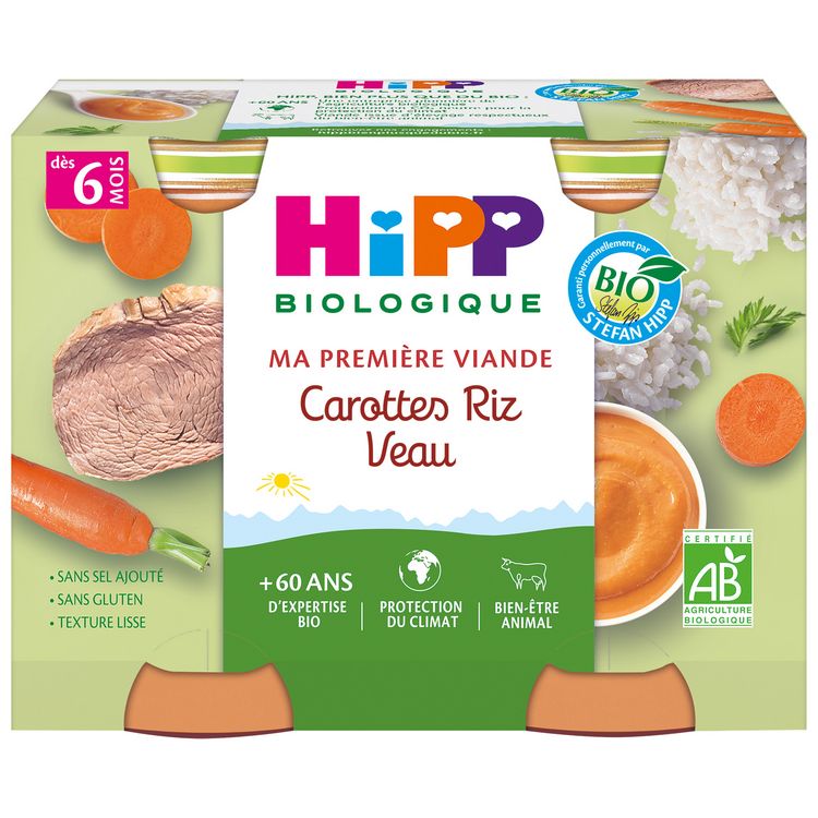Ingrédients : carottes* 40%, eau de cuisson, riz* cuit 24%, veau* 8%, huile de colza* 2%*Produits issus de l’Agriculture BiologiqueSANS GLUTEN