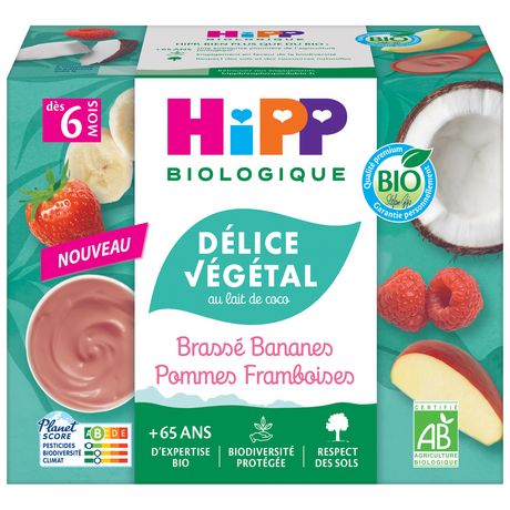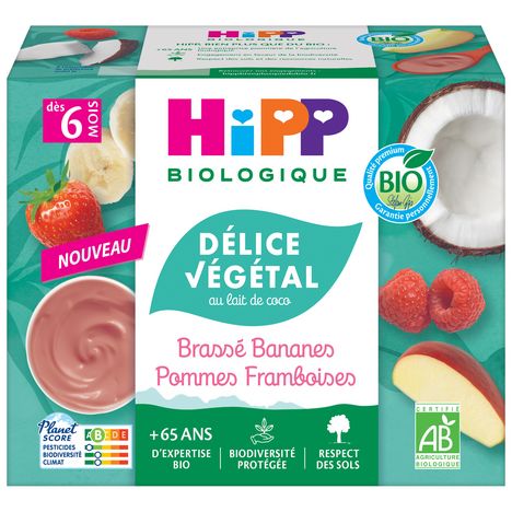 Dessert infantile biologique adapté à l'enfant. Brassé végétal Bananes Pommes Framboises Bio