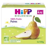 100% Fruits – 100% Plaisir ! Les coupelles 100% Fruits HiPP offrent à votre bébé ce que la nature a de meilleur avec : ✔ des fruits bio cueillis à maturité, ✔ une cuisson douce afin de préserver au mieux leurs qualités nutritionnelles et leurs saveurs, ✔ sans sucres ajoutés. Les purées de fruits HiPP sont délicieuses fraîches ou à température ambiante, en dessert ou pour le goûter. 1 coupelle de fruits HiPP = 1 portion de fruits. Coupelles sans BISPHÉNOL A ni PHTALATES. Purée de fruits biologique adaptée à l’enfant : poires