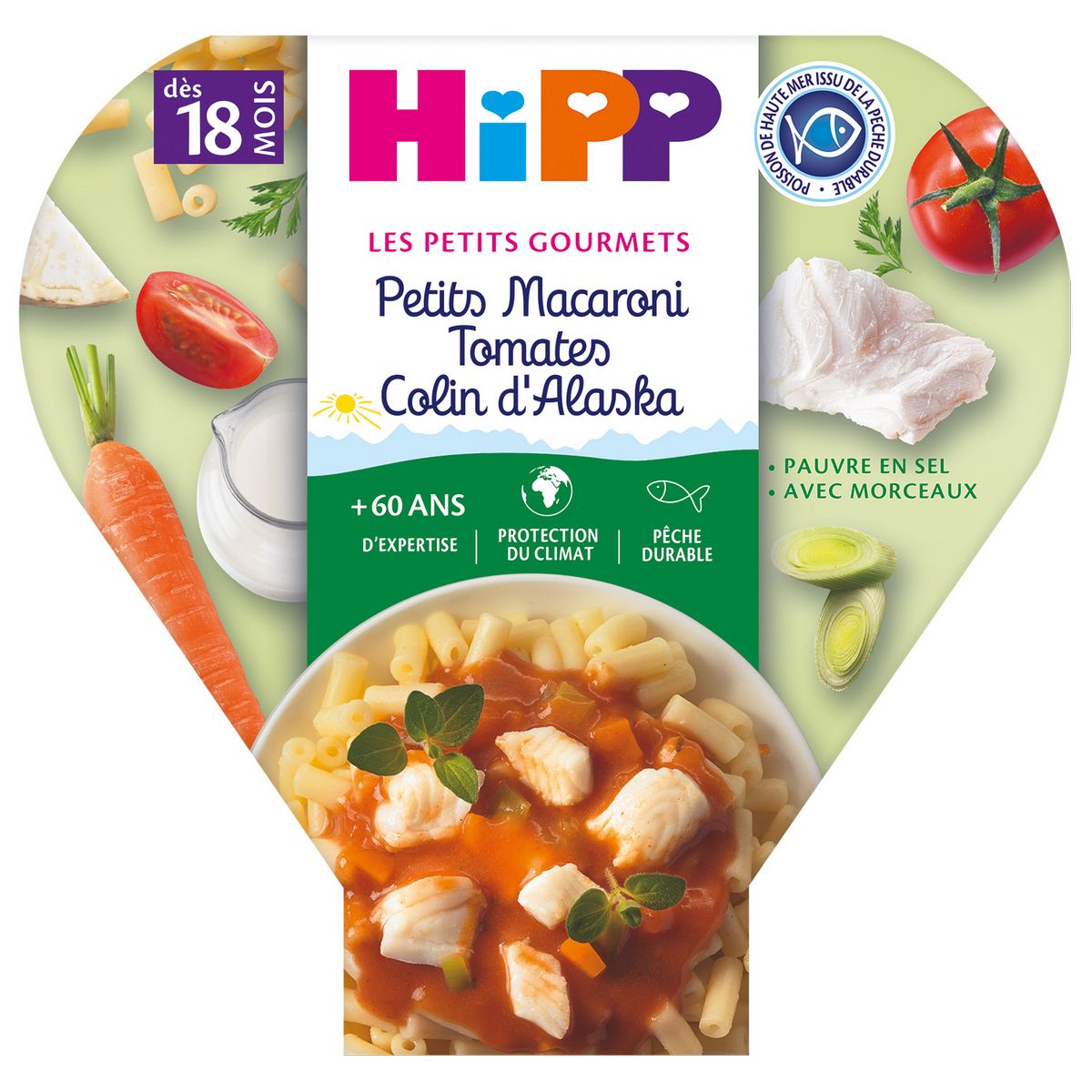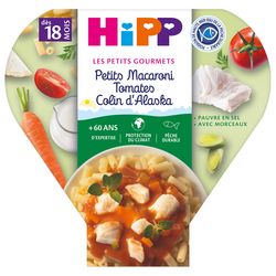 Plat complet adapté à l'enfant. Petits Macaroni Tomates Colin d'Alaska