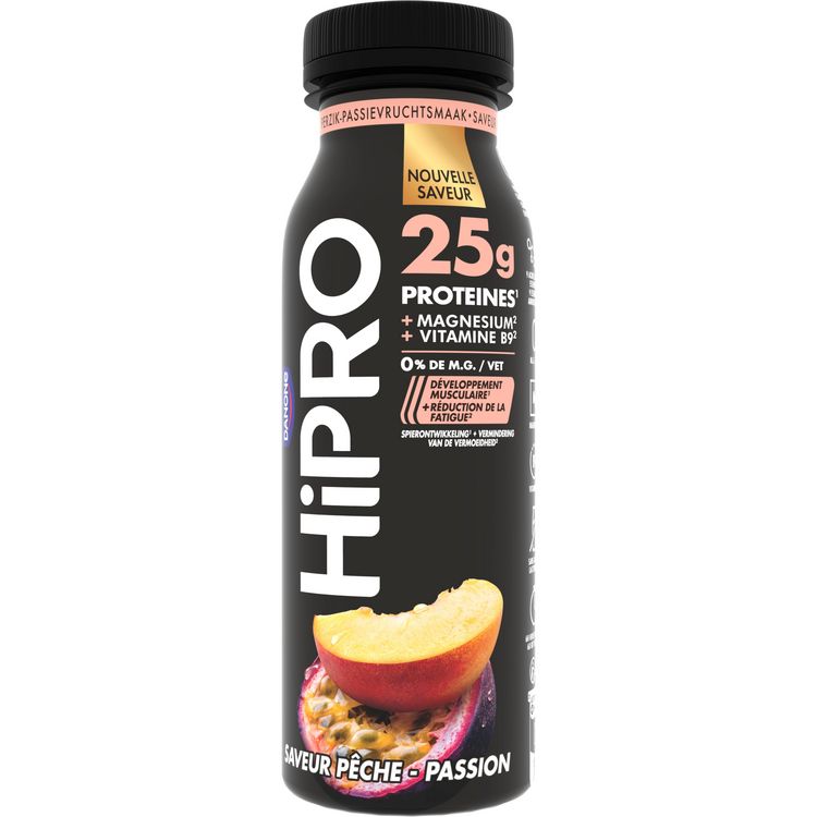 Les bouteilles HiPRO contiennent 25g de protéines pour contribuer au développement musculaire et sont enrichies en magnésium et vitamine B9 pour aider à réduire la fatigue. Avec 0% de matière grasse, les bouteilles peuvent se consommer jusqu'à 6h hors du frigo ce qui en fait le parfait encas à emporter pour tous les sportifs. Nourris tes progrès avec HiPRO.