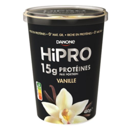 HiPRO vanille protéiné est disponible en grand-format! Le nouvel allié de la nutrition sportive, avec ses 15g de protéines par portion de 160g et 0% de matières grasses. Les protéines d'HIPRO contribuent au maintient de la masse musculaire. Un yaourt protéiné au bon goût de vanille et à la texture consistante et onctueuse, pour le petit-déjeuner,en snack ou en dessert. L'encas idéal pour les sportifs , le tout Nutri-score A!
