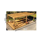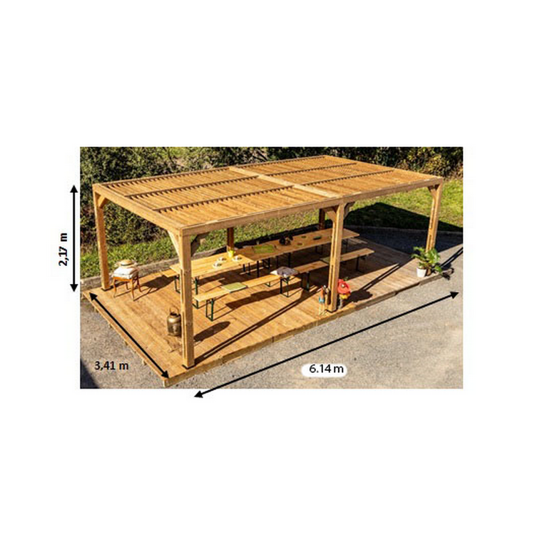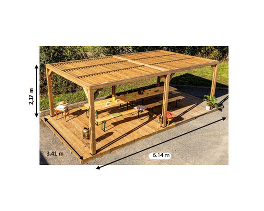 Matière: Pergola en épicéa traitée haute température avec poteaux 12 x 12 cm (2 pièces moisées de 12x 4 cm assemblées avec des tirefonds de 7 cm).