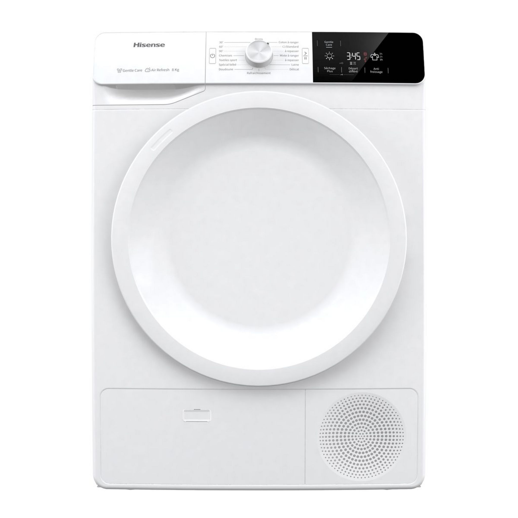 Hisense vous propose ce sèche linge d'une capacité de 8 Kg, il fonctionne avec un système de séchage par condensation et propose pas moins de 16 programmes avec entre autres les classiques coton ou délicat mais aussi certains plus spécifiques comme le programme sport ou encore chemise. Ce sèche linge propose aussi un programme anti-froissage.