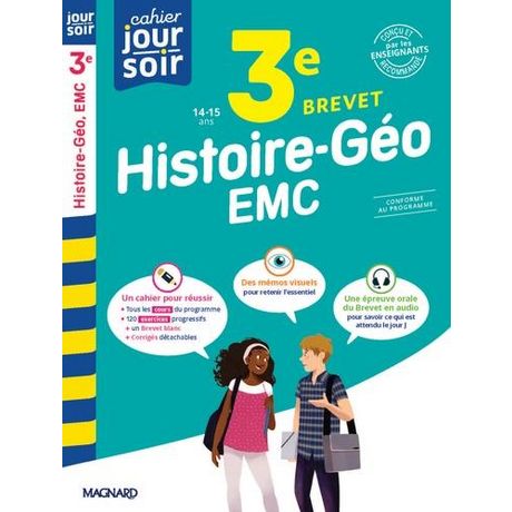 Le cahier complet pour des révisions efficaces l'année du Brevet Le cahier complet pour des révisions efficaces l'année du Brevet Réviser tout le programme de 3e et s'entraîner pour le Brevet grâce à : - Des leçons claires et synthétiques en histoire, géographie et EMC - Une riche iconographie et de nombreuses cartes - + de 120 exercices pour s'entraîner au Brevet - Des Brevets blancs - Les corrigés de tous les exercices et Brevets blancs au centre du cahier à détacher - Scannez les QR codes pour accéder à : - des mémos visuels, schémas et cartes mentales, pour mieux mémoriser - un exemple en audio d'épreuve orale du Brevet, complète et réussie, pour avoir un exemple concret de ce qui est attendu le jour J