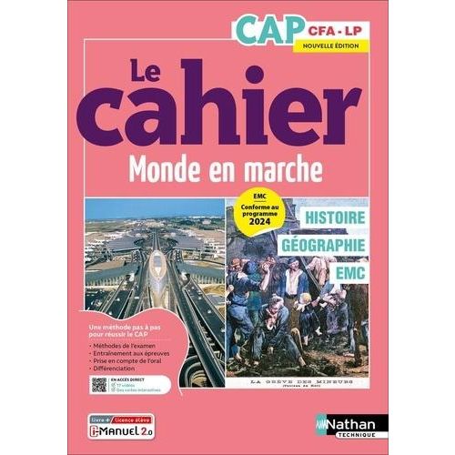 Ce cahier d'Histoire-Géographie - EMC CAP permet de traiter le programme de CAP tout en s'adaptant au volume horaire et au rythme des stages et de l'alternance. Il est proposé au choix en livre papier + licence numérique i-Manuel ou en 100% numérique i-Manuel En version imprimée, cet ouvrage propose en complément une licence numérique i-Manuel 2. 0, la solution pour mettre les élèves en activité sur ordinateur ou sur tablette. En cas de prescription à l'ensemble de la alte (20 élèves minimum), l'activation de la licence élève est laissée au libre choix de l'enseignant. Dans la lignée du manuel Le Monde en Marche , ce cahier d'Histoire-Géographie - EMC met l'accent sur la préparation et la réussite du CAP, tout en proposant une mise en activité des élèves selon des modalités variées et en lien avec le monde professionnel. Cette édition propose une actualisation des données et la mise à jour de la partie EMC conformément au programme en vigueur (B. O. du 13 juin 2024). Dans cet ouvrage : - 10 modules indépendants pour préparer le CAP, à traiter en fonction des horaires, du rythme des stages et de l'alternance. - Une démarche en 3 temps qui place l'élève en acteur de ses apprentissages : 1. Un travail en alte entière pour une entrée dans le thème , 2. Un travail en groupes pour un approfondissement actif et la mobilisation des élèves dans la résolution d'un cas lié au thème (2 situations proposées) , 3. Un travail individuel ou en binôme pour une préparation efficace à l'épreuve du CAP (présentation orale d'un document, méthodologie pas à pas, évaluation finale). - Une partie EMC , conforme au programme en vigueur (B. O. du 13 juin 2024), à traiter collectivement. - 20 vidéos pour s'entraîner à l'oral.