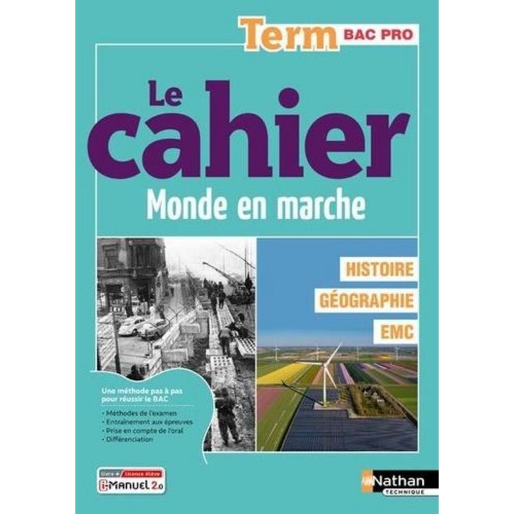 Dans la lignée des manuels Le Monde en marche , ce cahier permet de traiter le programme de Terminale et propose une préparation efficace de l'examen, tout en s'adaptant au volume horaire et au rythme des stages ou de l'alternance. Il est proposé au choix en livre papier + licence numérique i-Manuel ou en 100% numérique i-Manuel. En version imprimée, cet ouvrage propose en complément une licence numérique i-Manuel 2. 0, la solution pour mettre les élèves en activité sur ordinateur ou sur tablette. En cas de prescription à l'ensemble de la alte (20 élèves minimum), l'activation de la licence élève est laissée au libre choix de l'enseignant. Ce cahier s'articule autour d' une démarche en trois temps , qui place l'élève en acteur de ses apprentissages : Tout d'abord, un travail en alte entière pour entrer dans le thème. Puis un travail en groupe qui permet d'approfondir et de mobiliser les élèves dans le cadre d'une étude de cas ou d'un dossier. Enfin, un travail individuel ou en binôme pour une préparation efficace au Bac. Ce cahier met particulièrement l'accent sur la préparation à l'examen , tout en permettant à l'enseignant une grande liberté d'organisation dans son travail. Des sujets type Bac sont proposés à la fin de chaque chapitre.
