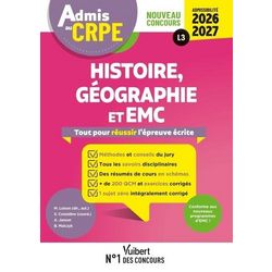 Un manuel rédigé par des jurys de concours au service de votre réussite ! Préparez-vous efficacement à la partie Histoire, Géographie et EMC de l'épreuve écrite du nouveau concours de professeur des écoles 2026-2027 (L3), grâce : - aux méthodes et conseils du jury , - à des fiches de cours aérées pour maîtriser l'ensemble des savoirs disciplinaires, des notions didactiques et des outils pédagogiques , - à des résumés de cours en schémas pour mémoriser facilement et de manière visuelle. - à + de 300 exercices et QCM corrigés pour valider vos connaissances et les mettre en application , - à 1 sujet zéro corrigé pour vous mettre dans les conditions du jour J.