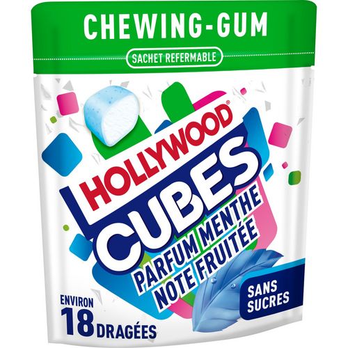 Chewing-gum sans sucres avec édulcorants - Parfum menthe-fruits. Hollywood Cubes, le chewing-gum qui libère vos sens et vous rafraîchit les idées ! Parfum menthe note fruitée, une recette gourmande et fruitée.