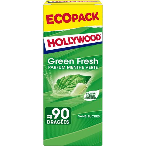 HOLLYWOOD - HOLLYWOOD Green fresh chewing-gums sans sucres menthe verte environ 90 dragées 128g.une bonne boîte de chewing-gum fraîcheur que j’ai eu pendant un mois .j’en rachèterais bientôt. Je recommande