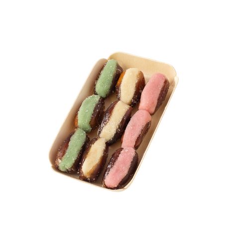 Ingrédients : 50% dattes : dattes déglet nour, sirop de glucose. 50% pâte D'AMANDES : sucre, AMANDES (33%), stabilisant : E420, sirop de glucose, humectant : invertase, colorants : E120, E161b.
