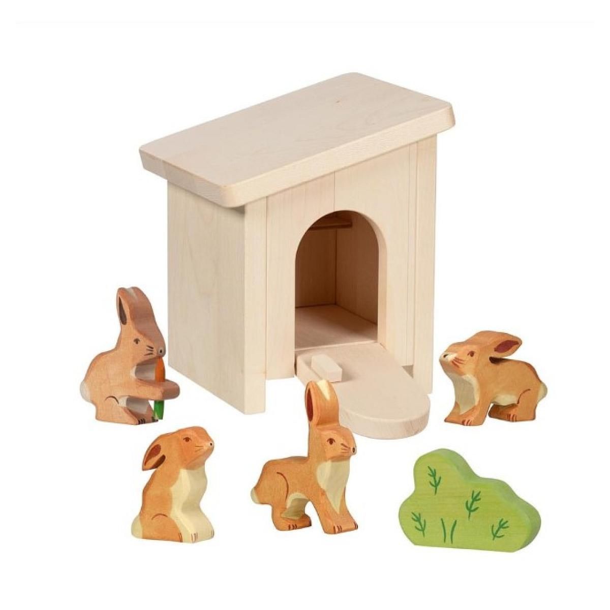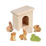 Kit de jeu en bois - Comprend une écurie, quatre figurines de lapins et un petit buisson Conçu avec amour : dans des couleurs naturelles, avec des formes arrondies pour une expérience de jeu agréable Dimensions compactes : 16 x 15 x 18,5 cm - Idéal pour les petites mains des enfants Favorise le jeu