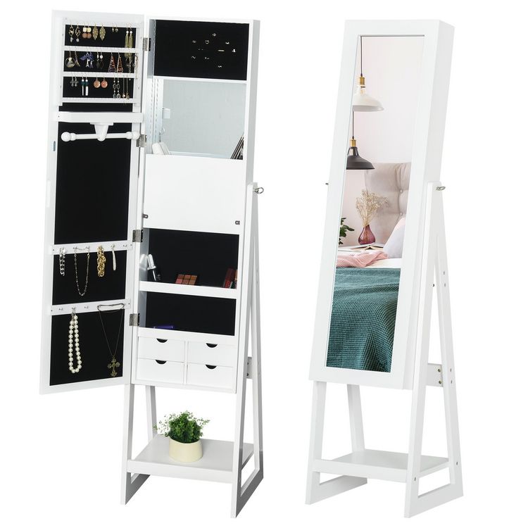 Ce miroir de rangement HOMCOM combine design élégant et fonctionnalité avec un miroir en pied ajustable et divers rangements : 80 emplacements pour boucles d'oreilles, 12 crochets pour colliers, 98 pour bagues, un porte-bracelet, un panneau escamotable, deux étagères, trois boîtes et quatre tiroirs.