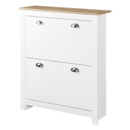 Armoire à chaussures 2 portes abattantes 2 compartiments poignées coquilles métal MDF blanc chêne clair