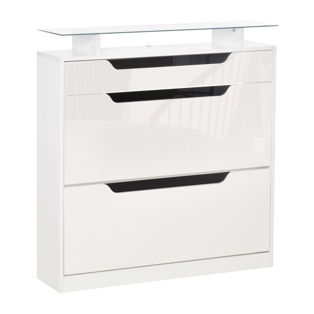 Armoire à chaussures avec 2 tiroirs rabattables + 1 tiroir coulissant + 1 comptoir et 1 plateau en verre étagère réglable sur 2 niveaux 89 x 23 x 96 cm blanc