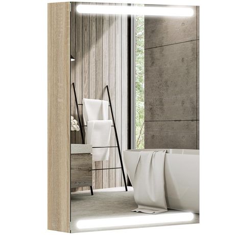 Armoire murale salle de bain 1 porte miroir lumineux LED intégré 50 x 70 cm 2 étagères verre effet bois