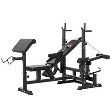 - Grande variété possible d'exercices : développé-couché grâce au repose-barre (chandelles), poignées à dips, module pour entraîner les muscles des jambes, bras et pectoraux, module de tirage horizontal, pupitre à biceps pour barre Curl