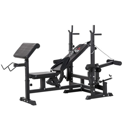 Banc de musculation multifonction réglable - pupitre à biceps, repose barre curl, poignées à Dips, module extension bras jambes, résistance horizontale - acier noir