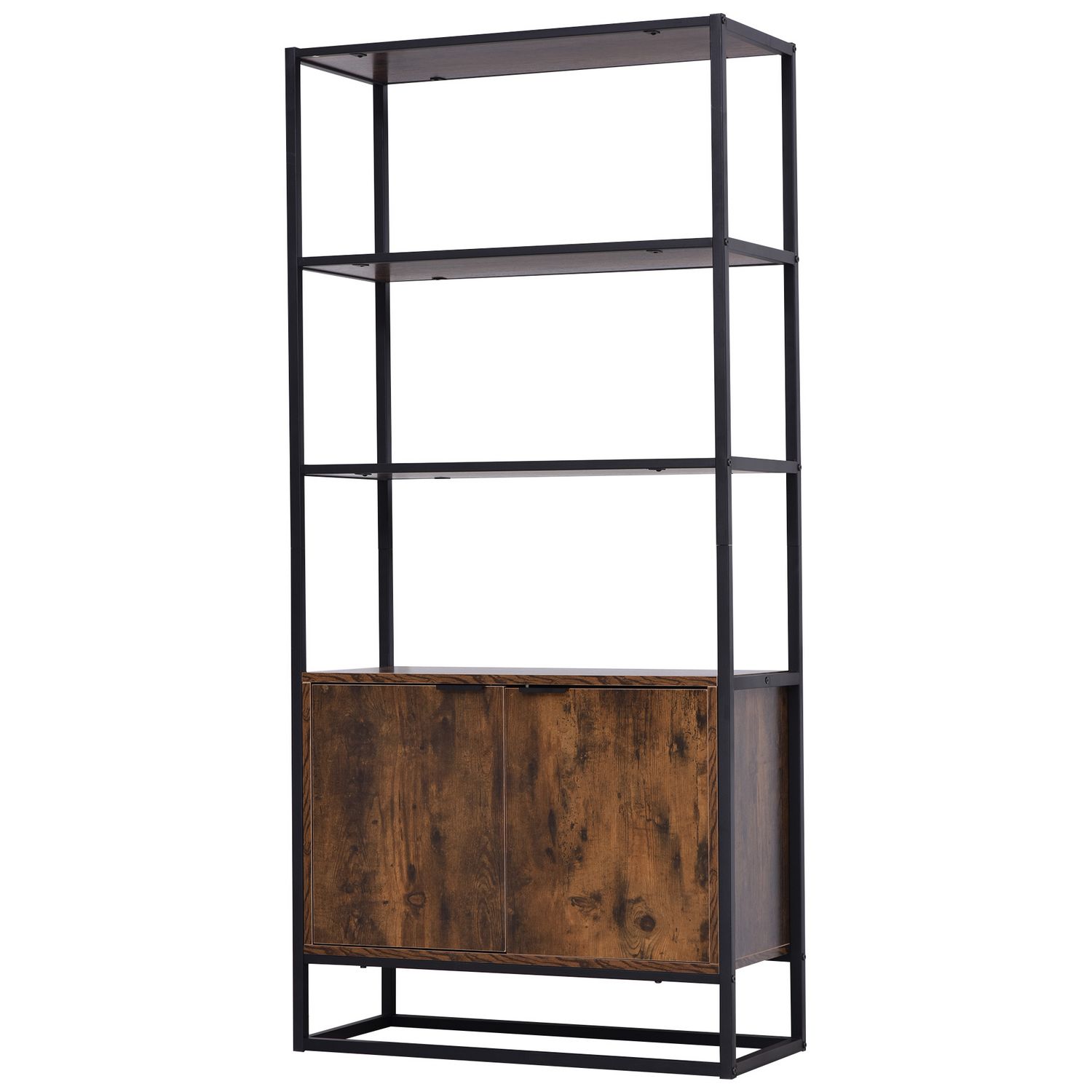 Bibliothèque style industriel 3 étagères + placard 2 portes panneaux particules aspect vieux bois métal noir