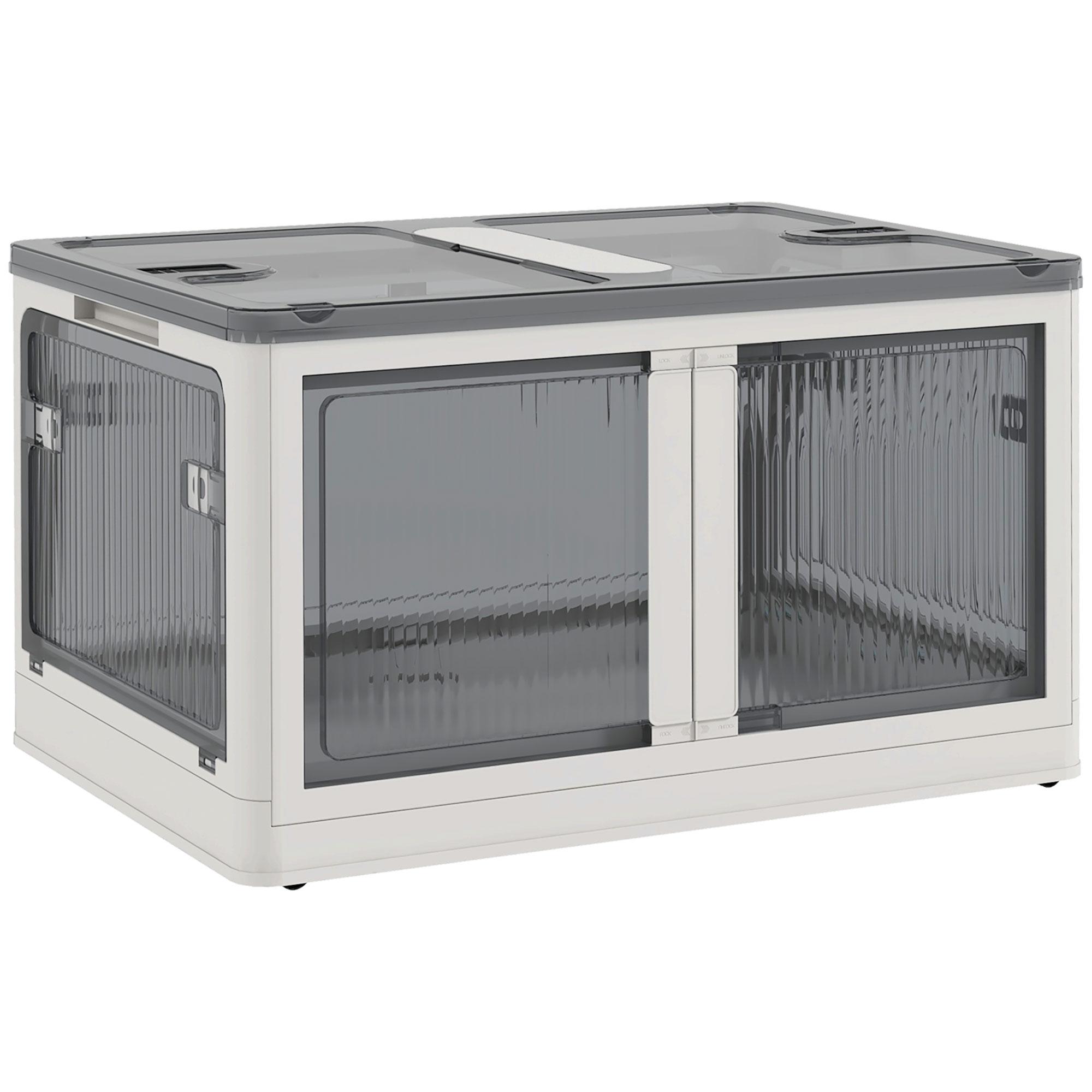 Boîte de rangement plastique 69L pliable empilable couvercle 4 roulettes accès 5 côtés blanc gris