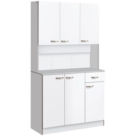 Ce joli buffet haut de cuisine blanc gris avec poignées métal alu. ajoutera une touche de modernité et d'élégance supplémentaire à votre intérieur. Disposant de nombreux rangements haut et bas (6 portes, 1 tiroir, grand plateau), cette armoire vous sera très pratique d'utilisation pour devenir rapid
